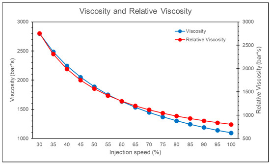 - In the injection speed experiments, this study observed that when the injection speed was higher, the change in relative viscosity was smaller; conversely, when the injection speed was lower, the change in relative viscosity was greater.