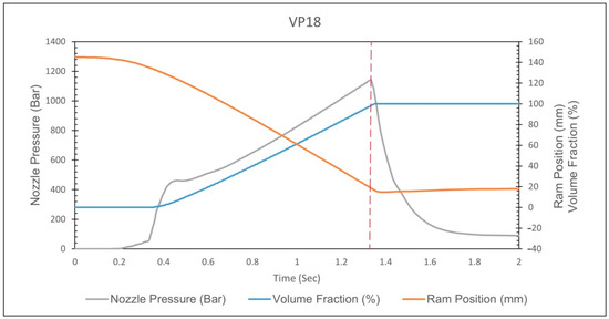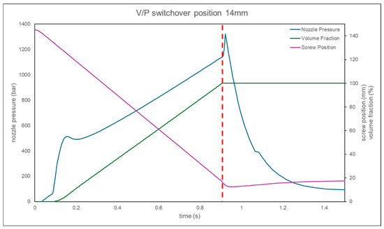 The nozzle pressure, ram position, and volume fraction at the V/P switchover position of 18 mm.