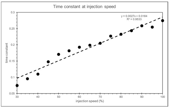 where t0.8×injection_speed is the time from the start of injection to the point where the injection speed reaches 80% of the set value. In this study, the time constant for each injection speed is determined using the above formula, and the time constant for the input into the simulation is obtained through linear regression, as shown in Figure 27.