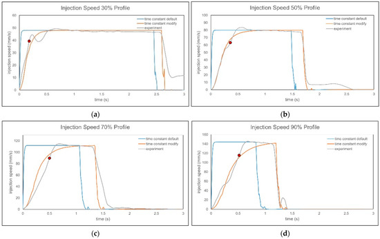 By comparing the injection speed curves before and after time constant correction, the results show that at lower injection speeds, the experiment and simulation injection speed curves are very close after correction. However, at higher injection speeds, differences remain between the experiment and the simulation due to the different methods of achieving the target injection speed, as shown in Figure 28. In the picture, the red dots indicate the points where 80% of the injection speed is reached, demonstrating that the calculated positions using the above formula are highly accurate and confirming the effectiveness of the method.