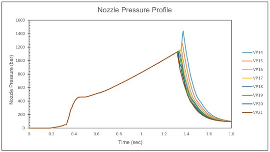 At lower injection speeds, the nozzle peak pressure tends to remain constant, while the change in the timing of the peak pressure is more significant. Conversely, at higher injection speeds, the nozzle peak pressure shows larger variations, but the change in the timing of the peak pressure is relatively small, as shown in Figure 8.