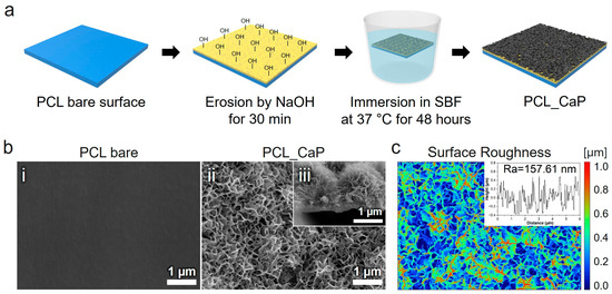 (a) Schematic diagram of the preparation of “PCL_CaP” nanostructured surfaces. (b) Representative SEM images showing the (i) surface of “PCL bare”, (ii) surface of “PCL_CaP”, and (iii) cross section of “PCL_CaP.” (c) Surface roughness for the “PCL_CaP” nanostructured surface.
