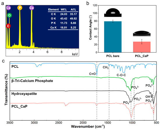 (a) EDS images; (b) WCA of the “PCL_CaP” nanostructured surface; (c) FT-IR spectra (including PCL, β-Tri-Calcium Phosphate, hydroxyapatite, and “PCL_CaP”).