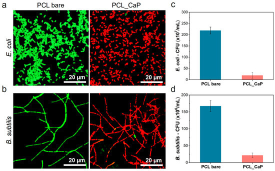 Confocal microscopy images of (a) E. coli and (b) B. subtilis cultured on the “PCL bare” surface and the “PCL_CaP” nanostructured surface (green: live cells; red: dead cells). CFU of (c) E. coli and (d) B. subtilis cultured on the “PCL bare” surface and the “PCL_CaP” nanostructured surface.