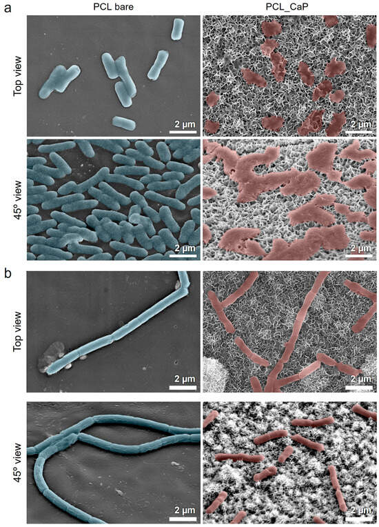SEM images of (a) E. coli and (b) B. subtilis cultured on the “PCL bare” surface and “PCL_CaP” nanostructured surface.