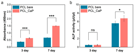 Moreover, ALP activity analysis was performed to assess pre-osteoblast differentiation in relation to the “PCL_CaP” nanostructured surface. ALP activity is strongly linked to the mineralization capacity of osteoblasts, serving as a valuable marker for assessing pre-osteoblast differentiation [51]. As shown in Figure 5b, on day 3, there was no significant difference in ALP activity between the “PCL bare” and the “PCL_CaP” nanostructured surface. However, by day 7, ALP activity was noticeably higher in the “PCL_CaP” nanostructured surface. As mentioned above, CaP is well recognized for its biocompatibility and osteoconductivity, making it a widely used material in bone-related applications. Additionally, it has the benefit of enhancing osteoblast activity [52,53,54]. Therefore, it was confirmed that the “PCL_CaP” nanostructured surface enhances osteoblast differentiation through its osteoconductive properties. Consequently, the “PCL_CaP” nanostructured surface not only promotes pre-osteoblast attachment and proliferation by increasing surface area but also supports osteoblast differentiation through its osteoconductivity.