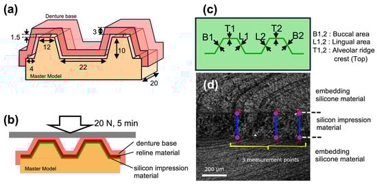 Illustrations of fitting accuracy test using simplified edentulous ridge model. (a) Dimensions of the simplified edentulous ridge model (master model) and the experimental denture base. (b) During the fitting accuracy test, the gap between the relined denture and the master model was filled with silicone impression material. (c) Silicone impression material representing the gap was embedded in silicone resin for further handling, and measurements were taken in each designated area. (d) The thickness of the silicone impression material (representing the gap) was measured using a laser microscope (OLS4000, Olympus, Tokyo, Japan).