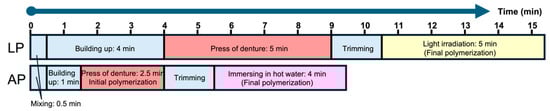 Process diagram ofreline. Relining process of light-polymerizing reline material (LP: upper) and relining process of auto-polymerizing reline material (AP: lower).