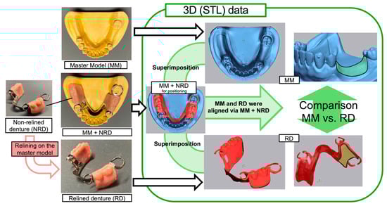 A non-relined denture (NRD) was placed onto a Master Model (MM) with a resorbed residual ridge, and this assembled model (MM + NRD) was used for positioning. The MM and relined denture (RD) data were aligned by superimposing them onto the MM + NRD, and the residual ridge surface of the MM was compared with the tissue surface of the RD.