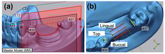 Reference points, planes, and measurement lines. (a) Reference plane (1) consisting of three reference points of #33 buccal, #37 distal (solid red points) and posterior wall of model (dotted red point) on the master model, and parallel reference planes (2) and (3); (b) measurement lines on the master model separated by the reference planes and the guiding surfaces (yellow dotted line) of #34 and #37.