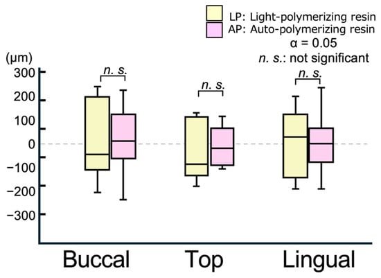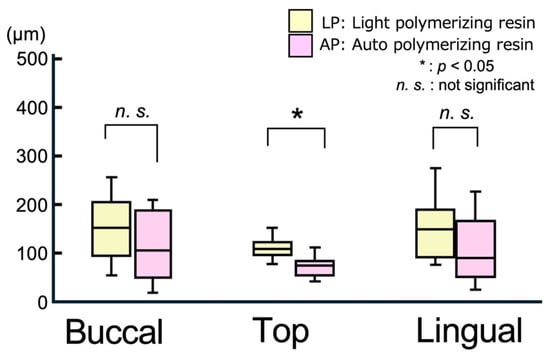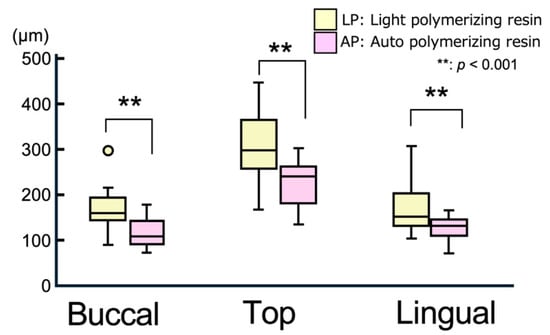 The fitting accuracy was attributable to various factors. For the AP resin, polymerization began immediately upon mixing, enabling prolonged contact with the model during shaping and enhancing fitting accuracy. However, the LP material did not start to polymerize until light curing was initiated, yielding free shrinkage while it was being removed from the model [23]. This yielded significant deformation. The fitting accuracy was attributable to various factors, such as residual stress during removal from the model [23], viscoelasticity of the resin [9], and morphology of the ridge [11,24].