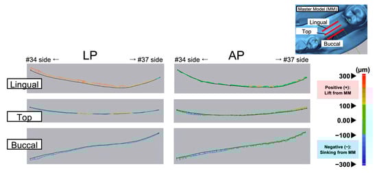 In all areas, the degree of lift and sinking (Figure 7) of the tissue surface of the relined denture differed relative to the master model, with no significant differences between the materials (Figure 6). Figure 8 shows the RMS values, which indicate the degree of deviation from the master model. The smallest RMS values for both materials were observed at the alveolar ridge crest, with the APs showing a significantly smaller RMS value [90.5 (25.0) μm] than the light-polymerizing resin [123.3 (16.4) μm] at the crest (p = 0.015). However, no significant differences were observed between the materials on the buccal and lingual sides. Furthermore, no significant differences were observed in the displacement and RMS values of each material, even when the measurement sites were different.