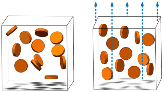 Among all forms of presentation, BN in platelet form exhibits a higher D/t ratio, displaying significant anisotropy, with thermal conductivity strongly influenced by the orientation of the platelet. Its in-plane thermal conductivity can approximately reach 300–600 W m−1K−1, and through-plane only reaches about 30 W m−1 K−1. Therefore, the orientation of the BN platelets was anticipated to have a significant impact on the thermal conductivity of the BN-filled composites. However, research on the influence of orientation has only been thoroughly examined in recent times and continues to be a significant subject for scientists [37]. In a schematic manner, in Figure 1, the orientation process of composites containing BN platelets is presented.