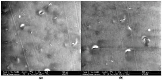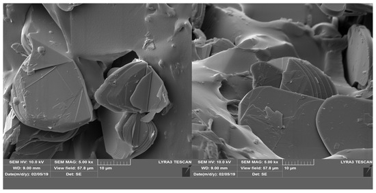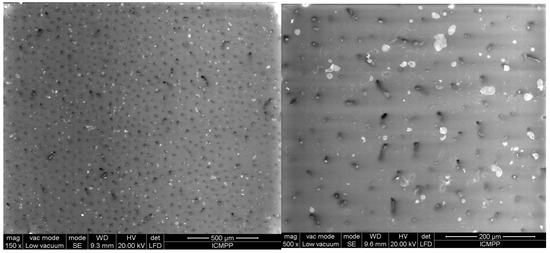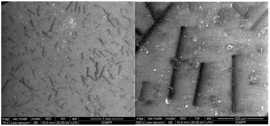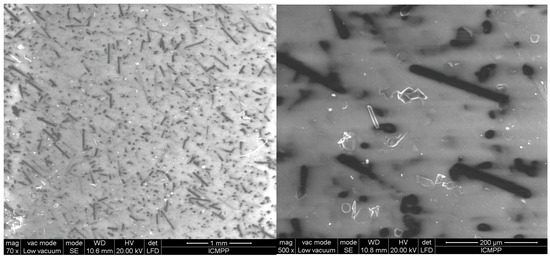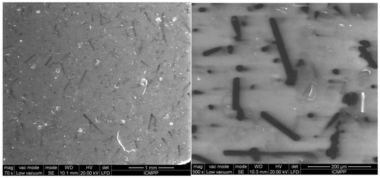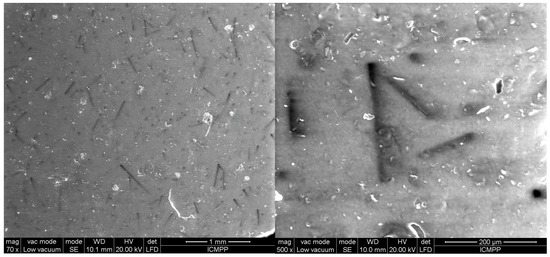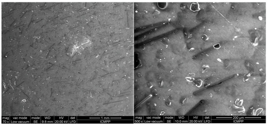 The outcomes appear alike for both R5 and R6, as shown in Figure 8 and Figure 9 compared to Figure 6 and Figure 7, but here, the carbon microfibers’ orientation is more facile due to their lower content (1%) at a comparable BN content (here 12.5%). However, it can be noted that there are still areas where the carbon microfibers are not completely absorbed in the chains, with some remaining partially attached horizontally to the surface of the material. When Figure 7 and Figure 9 are compared at 70 magnification, it is clear that there are fewer chains in the composite with fewer carbon microfibers.