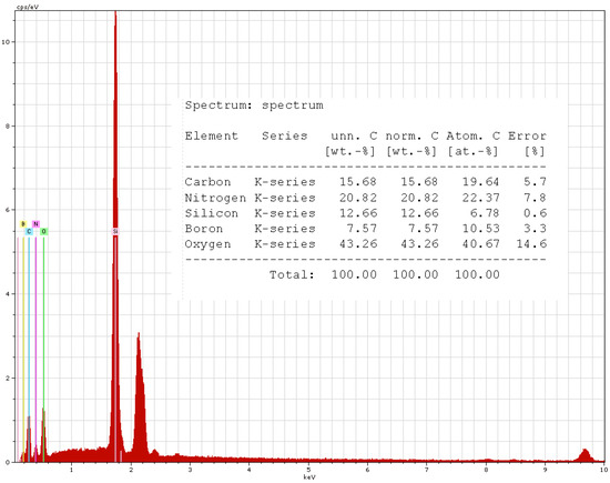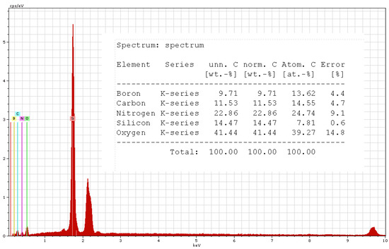 The compositions of the samples were investigated using a scanning electron microscope. Only two samples were included in the results because their composition was very similar, i.e., for R3 (with 10% BN platelet addition and 2% carbon microfiber addition) in Figure 15 and for R5 (with 12.5% BN platelet addition and 1% carbon microfiber addition) in Figure 16. The comparative variations in C and B are emphasized. However, a key finding was that no residual technological impurities such as Al, S, etc., were discovered in the analysis. This outcome enables a more accurate assessment of the analysis of the dielectric parameters that will be further addressed.