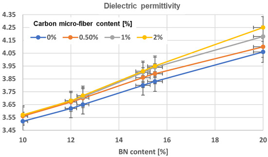An obvious increase in permittivity values is observed in all composites with aligned particles, regardless of their composition. The higher the concentration of BN platelets, the greater the enhancement, but the effect decreases gradually after reaching a concentration of 15%. The impact of incorporating carbon microfibers on the dielectric permittivity of homogeneous composites is clearly beneficial, especially when the BN content surpasses 12%. The value of a material containing 15.5% BN and 2% carbon microfibers is comparable to that of a material with 20% BN and without fibers. The technological advantage of producing materials with microfibers could be ongoing as the price of BN platelets is at least 10 times greater than carbon microfibers. The examination of the dielectric loss factor (TgDelta) indicates a slight distinction between uniform and oriented-particle composites across all formulations. For samples containing only BN, the resistivity decreases slightly as the BN content increases, and there is minimal difference between similar recipes with either uniformly or oriented particles. Noticeable variations are clearly observed in the samples that have microfibers, with the resistivity being at least 104 times lower compared to samples containing only BN. Conversely, the alignment of particles once more decreases the resistance by at least 103 times.