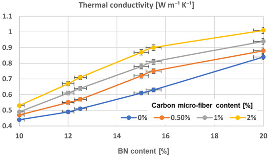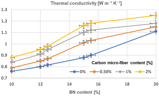 The results of this research demonstrated better outcomes for composites containing BN platelets and carbon microfibers than previous results presented in the literature, while also using a simpler technology for processing the polymer matrix and aligning particles.