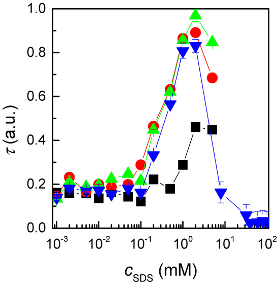 The turbidity measurements give significant insights into the relationship between the polyelectrolyte and surfactant under the specific conditions employed to prepare the mixtures. First, irrespective of the ageing time, distinct regions with different characteristics are evident. At the lowest and highest surfactant concentrations, the turbidity remains almost constant at very low values, indicating that the samples are transparent. This behaviour is consistent with the presence of polyelectrolyte complexes carrying an excess charge, which is positive when the concentration of charged monomers exceeds that of SDS, or negative at the highest surfactant concentrations (see Figure 2b). In contrast, between these two regions of low turbidity, a sharp increase in the turbidity is observed, reaching a maximum before decreasing again as the surfactant concentration increases. This phenomenon can be attributed to the instability of the samples, which is likely a consequence of the reduced colloidal stability of the formed complexes due to their diminished charge. Over time, these complexes may undergo aggregation and sedimentation, resulting in the formation of a dense solid phase. Furthermore, the region corresponding to the turbidity peaks is relatively broad, spanning approximately one order of magnitude in surfactant concentration, which agrees with the findings of previous studies on QHECE–SDS mixtures [47,48,49,50].