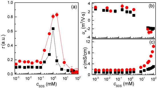 The turbidity of the mixtures, defined as τ = 1–10−A with A being the absorbance of the analysed sample, was evaluated at a wavelength of 450 nm using a Jasco FP-6500 spectrophotometer (Jasco Inc., Tokyo, Japan). This specific wavelength was selected to ensure the absence of adsorption bands associated with the mixture components that interfere with the measurements. The effective charge density of the complexes was assessed through their electrophoretic mobility (ue) determined using Laser Doppler Velocimetry with a Nanosizer ZS (Malvern Instruments, Malvern, UK). The electrophoretic mobility and zeta potential (ζ) are related by Henry’s equation [40]. The specific conductance of the aqueous mixtures was assessed using a Metrohm 856 Conductometer (Metrohm AG, Herisau, Switzerland) fitted with a platinum 5-ring conductivity cell (Metrohm AG, Herisau, Switzerland). The results, representing the average of 10 separate measurements, demonstrated consistent accuracy and reproducibility exceeding 95%.