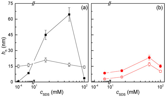 Dependence of the hydrodynamic thickness, hh, on the SDS concentration for the adsorption of the QHECE–SDS complex on negatively charged solid surfaces. (a) Results corresponding to the adsorption of samples prepared by high-concentration mixing. (b) Results corresponding to the adsorption of samples prepared by gradient-free mixing. Open and solid symbols represent the data obtained before rinsing and after rinsing, respectively.