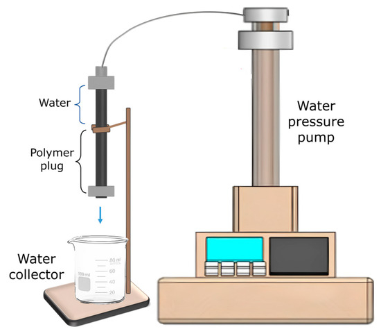 The resistance of the solid resin plug to applied water pressure was tested in a laboratory-scale setup using a water pressure pump (Isco D-Series Pump, Teledyne, Lincoln, NE, USA), as presented schematically in Figure 1. A steel tube plugged with the resin was placed in a vertical direction and attached to the pressure pump at the top. The bottom of the tube was opened during the test and a water collector was placed below. During the test, the pressure was gradually applied (intervals of 70 psi) up to 2175 psi or until observation of water leakage. A successful test was characterized by no water leakage through the resin plug and resin plug/steel interface at the applied pressure.