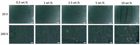 The influence of the initiator concentration on the microstructure of the solid resin was evaluated using optical microscopy. The surface morphology of solid samples containing 0.5 wt.%, 1 wt.%, 2.5 wt.%, 5 wt.%, and 10 wt.% of the initiator (potassium persulfate, PP) are shown in Figure 2. At higher initiator concentrations, the samples had more irregular surfaces, with the presence of particles and a few micro-pores for the 10 wt.% sample, indicating the cross-linking reaction rate was too high. The defects are likely caused by areas of fast localized polymerization that do not allow uniform polymer chain reactions and rearrangements. At lower initiator concentrations, the samples showed smoother and more homogeneous surfaces, with no visible pores or particles, indicating an optimal cross-linking process. Therefore, a concentration lower than 2.5 wt.% of the initiator was required to obtain a uniform solid resin.