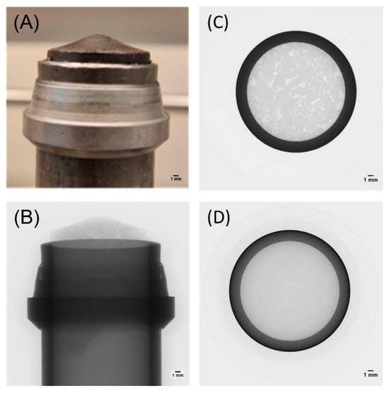 (A) The solid resin plug inside a steel tube, (B) the CT scan of (A), (C) a cross-section CT scan image of a sample with 10 wt.% initiator, and (D) a cross-section CT scan image of a sample with 0.5 wt.% initiator. The increased grayscale intensity corresponds to a higher density. The scale bar represents 1 mm.