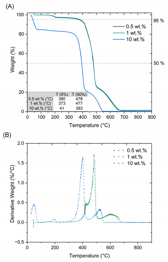 Thermal decomposition of the solid resin with 0.5 wt.%, 1 wt.%, and 10 wt.% of the initiator (PP). (A) TGA curves: the temperatures T (5%) and T (50%), for which 5% and 50% of the solid resin mass was decomposed, are highlighted on the TGA graph by horizontal dashed lines and summarized in the table. (B) Derivatives of the respective TGA curves.
