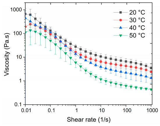 The influence of the shear rate on the viscosity of the liquid resin at temperatures between 20 °C and 50 °C. The solid curves represent the average viscosity value of three samples.