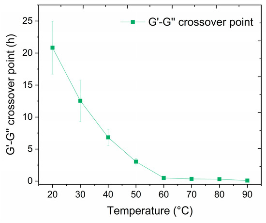 Variation in the storage (G′) and loss (G″) moduli crossover point as a function of the cross-linking temperature.
