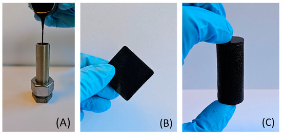(A) The liquid resin being poured into a steel tube. (B) The solid resin after cross-linking in a square steel mold. (C) The solid resin plug after cross-linking in a steel tube mold.