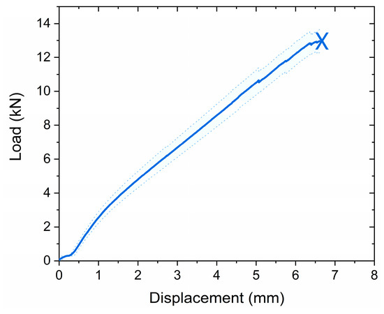 A load–displacement curve of solid resin plugs (0.5 wt.% initiator) tested during compression. The blue solid curve represents the average load value of five samples with a cross-sectional area of 2.54 cm2. The error bar areas are filled under the blue dotted curve.