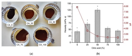(a) Photograph of CA_X adhesives (X = 0, 25, 50, 75, and 100). (b) Effect of citric acid amount (0, 25, 50, 75, and 100%) on viscosity and pH. Samples subscripted by * are significantly different in terms of viscosity and pH at p < 0.05.