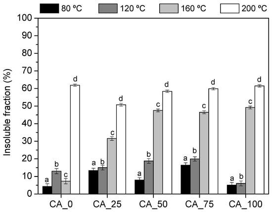 The curing behavior of CA_X adhesives was evaluated by oven-drying them at different temperatures (80, 120, 160, and 200 °C) to promote their curing. After this, the cured resins were redissolved in water in order to access the impact of the citric acid amount on the efficiency of the curing process. When a resin is completely cured, its components are not able to dissolve into water. Contrariwise, if an adhesive is not totally cured at a specific temperature, the uncured fraction will be solubilized in water. Figure 2 presents the results obtained on the determination of the insoluble fraction of each adhesive.
