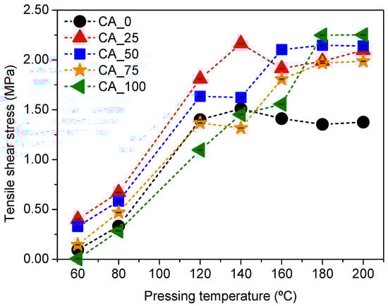 To confirm the effect of citric acid on the reactivity of polyphenolic extract, the bonding capacity of CA_X adhesives was evaluated using an ABES device, through the simulation of a hot-pressing process at defined conditions of temperature and pressure. The tensile shear strength of all bio-adhesives (35.0 ± 0.6 wt% of solid content) was tested at different pressing temperatures (from 60 °C to 200 °C) by fixing 120 s of pressing time in all cases. Figure 3 presents the obtained results.
