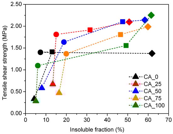 Relation between the insoluble fraction of CA_X adhesives (X = 0, 25, 50, 75, and 100) and shear strength at a specific temperature of curing, namely 80 °C (triangle), 120 °C (circle), 160 °C (square), and 200 °C (diamond).