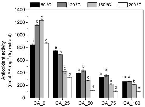Antioxidant activity measured by FRAP of the water-soluble fraction of the CA_X adhesives (X = 0, 25, 50, 75, and 100). Samples subscripted by different letters are significantly different in terms of temperature at p < 0.05.