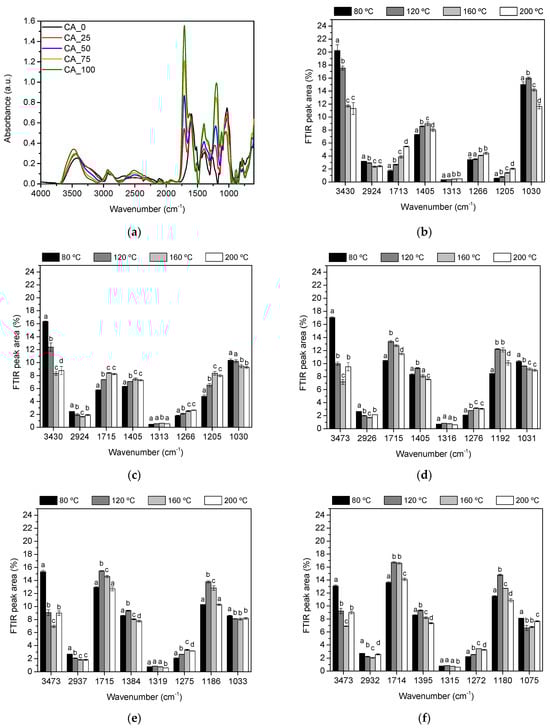 (a) FTIR spectra of CA_X bio-adhesives (X = 0, 25, 50, 75 and 100). FTIR peak area (%) of characteristic bands of (b) CA_0, (c) CA_25, (d) CA_50, (e) CA_75, and (f) CA_100. Bars subscripted by different letters are significantly different (p < 0.05) in terms of temperature.