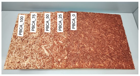 The bio-adhesives produced were tested in the manufacturing of particleboards, using poplar particles as raw material. The composite panels were hot-pressed at 160 °C for 10 min at a fixed thickness of 4 mm. Figure 7 presents the produced composite panels, using CA_0, CA_25, CA_50, CA_75, and CA_100 adhesives.