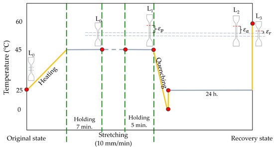 Shape memory tests were conducted using a universal testing machine (UTM) (Instron 5569 Model, Norwood, MA, USA) equipped with a heated chamber. Figure 1 depicts the stage of the shape memory test. The following procedures were carried out: (1) The specimen, which had an initial length of L0, was subjected to a constant Tp of 45 °C for a duration of 7 min. (2) The specimen was subsequently stretched to a strain of 100% at a rate of 10 mm/min. The length of the specimen, L1, was recorded to calculate the strain prior to unloading, p. The stretched specimen was held at a temperature of 45 °C for a duration of 5 min. Following that, the specimen was rapidly cooled using an ice pack. (3) The specimen was removed and stored at an ambient temperature for 24 h. The length of the specimen after aging, L2, was used to determine the strain after aging, a. (4) The stretched specimens were submerged in a water bath at a Tr of 60 °C to assess the specimen’s recoverability. The length of the specimen after recovery, L3, was used to calculate the residual strain after recovery, denoted as r. Experiments were performed on a minimum of five specimens for each experimental condition. The Rf and Rr values of the specimens were calculated according to the method described in reference [36].