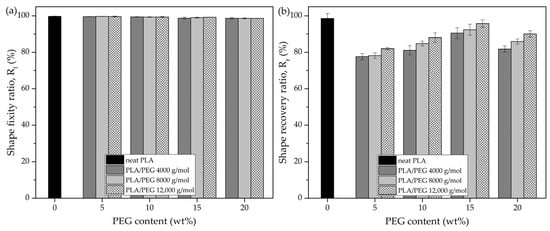 (a) Shape fixity ratio (Rf) and (b) shape recovery ratio (Rr) of neat PLA and PLA/PEG blends as a function of PEG content (0–20 wt%) and molecular weight (0–12,000 g/mol).