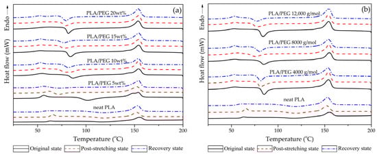 DSC thermograms of neat PLA and PLA/PEG blends at the original, post-stretching, and recovery states, showing (a) different PEG content (5–20 wt%) with a constant molecular weight of 12,000 g/mol and (b) different PEG molecular weights (4000, 8000, and 12,000 g/mol) with a fixed PEG content of 15 wt%.