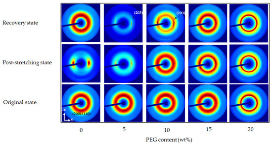 The 2D WAXS patterns of neat PLA and PLA/PEG blends at various PEG contents (5–20 wt%) with a constant PEG molecular weight of 12,000 g/mol during the shape memory test process.