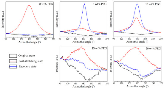 Azimuthal patterns of neat PLA and PLA/PEG blends at various PEG contents (5–20 wt%) with a constant PEG molecular weight of 12,000 g/mol during the shape memory test process.