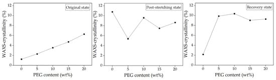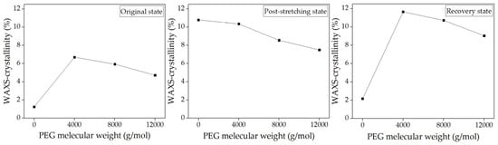 The azimuthal intensity and fc value, as shown in Figure 8 and Table 2, respectively, remained high for PLA blends with low-molecular-weight PEG, particularly at 4000 g/mol. In contrast, the PLA/PEG blend with 12,000 g/mol PEG exhibited an isotropic arrangement after recovery, with a low fc value close to its original state, while the Xc-WAXS (Figure 9) remained the same. This indicated that the amorphous chains had fully relaxed and rearranged to their disordered configuration. This finding ascribed the rationale behind the superior Rr of the blend containing 12,000 g/mol PEG, surpassing that of blends with lower molecular weights (4000 and 8000 g/mol).