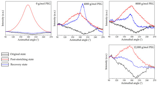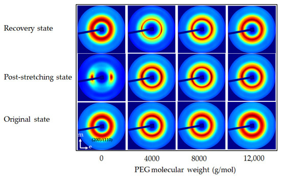 High crystalline domains also appeared to impact the shape recovery behavior of PLA/PEG blends negatively. In the recovery state, the 2D WAXS patterns shown in Figure 7 illustrated that PLA/PEG blends with PEG molecular weights of 4000 and 8000 g/mol retained two arcs of oriented chains along the equatorial direction. This suggested that they maintained an anisotropic arrangement after recovery. The strong arcs were attributed to the PEG phase, which promoted PLA crystallization at 60 °C from the oriented structure induced during stretching. Consequently, the Tg of PLA/PEG blends with PEG molecular weights of 4000 and 8000 g/mol after recovery (Table 1) were higher than that of their post-stretched specimens.