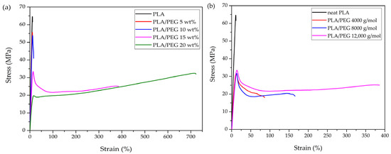 Stress–strain curves of neat PLA and PLA/PEG blends: (a) different PEG contents (5–20 wt%) with a constant molecular weight of 12,000 g/mol, and (b) different PEG molecular weights (4000, 8000, and 12,000 g/mol) with a fixed PEG content of 15 wt%.