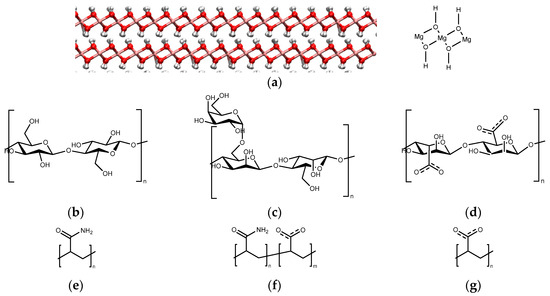 Structure of System Components. (a) Brucite (001) surface red spheres are oxygen; pink spheres are magnesium, and white spheres are hydrogen; monomer structures of the polymers studied (b) cellulose (c) guar gum (d) alginate (e) PAM (f) HPAM and (g) PAA.