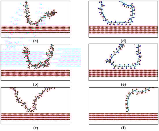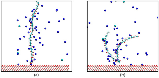 The molecular dynamics simulation strategy was developed based on the results of previous works [19], which provided evidence that adsorption sampling through MD is slow and challenging to capture. A new approach was used to force the polymer to be grafted onto the surface to optimize time and improve the sampling of polymer adsorption on the surface. To achieve this, fictitious interactions were generated between the surface and the polymer to guide the polymer into two study configurations: the first, where one end of the chain adsorbs in a perpendicular form denominated “End-grafted” configuration (Figure 2a), and the second, where a central group of the molecule adsorbs denominated “U-shaped” configuration (Figure 2b).