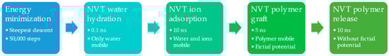 The simulation procedure is shown in Figure 3; it began with an energy minimization step to reduce the likelihood of simulation failure due to the generated initial configuration. This was followed by an NVT ensemble simulation where only the water molecules can move to form hydration layers around all the present compounds. Next, an NVT simulation was performed where water and ions could move to generate ion adsorption on the surface and the polymer. Then, an NVT simulation was carried out where fictitious interactions were activated to bring the polymer closer to the surface and keep it in that position. Finally, a final NVT simulation is conducted where all interactions are released, and the stability of the interactions between the polymer and the surface is analyzed.